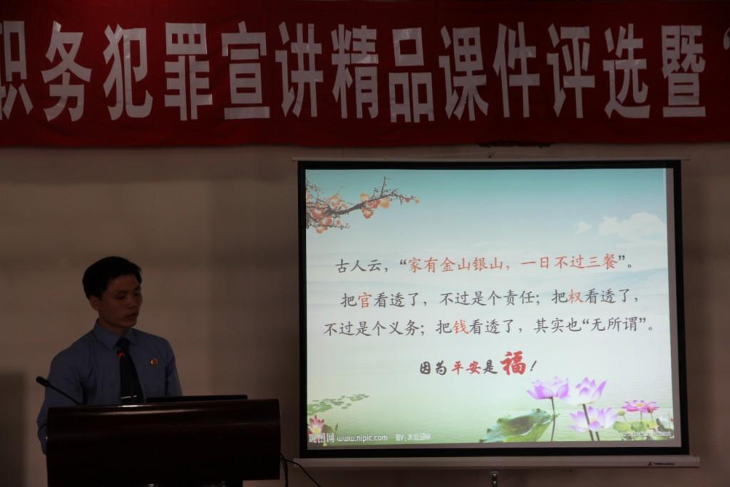 市院共有8名干警参加了预防宣讲精品课件评选活动,每位选手用10分钟的时间,集中展示了《珍惜自由、廉洁履职》《谁动了我的幸福》《守护教育净土、预防职务犯罪》《廉洁从税、远离职务犯罪》等8个宣讲课题的PPT课件,汇报了在银行、税务、教育等行业开展宣讲活动的具体思路,各位选手将文字、图片、漫画、微电影有机结合,用一系列案例、数字和生动感人的文章,展示了宣讲活动的思路、背景和设计意图,课件贴近生活和行业实际、内容丰富、设计精巧、界面优美、直观形象,具有实用性和技术性,起到了很好的警示教育宣讲辅助功能。董艳丽副处长代表评委做了经典点评,并对乌海市院预防宣讲工作给予了肯定和认可,指出乌海院开展的精品课件评选活动的创新工作举措,立意新、做法实,在全区预防部门是首家,同时还创新代表委员的联络方式,增强检察机关主动接受监督的效果,做法可圈可点。经过评选,白秀兰等3名干警的课件被评为“精品课件”,有5个课件被评为“优秀课件”。