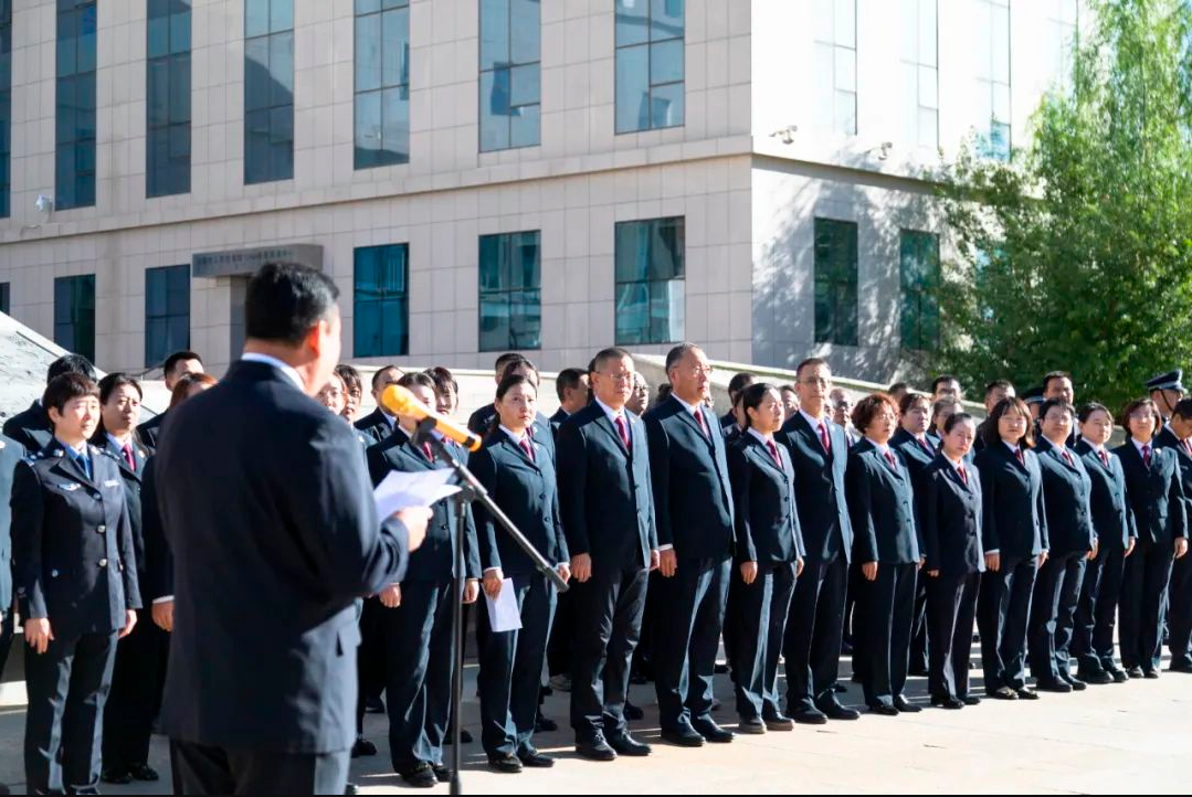 9月23日上午,全体干警在办公楼前整齐列队,共同参加升国旗仪式。法警警容严整,迈着铿锵有力的步伐,护送五星红旗走向升旗台。国旗在国歌声中缓缓升起,干警们庄严肃立,奏唱国歌,向国旗行注目礼。升旗仪式后,全体党员重温了入党誓词,诵读了党章,共同学习了民族团结进步创建有关内容,激励党员干警们在本职工作中勇于担当、积极作为、不断激发干事创业动力。